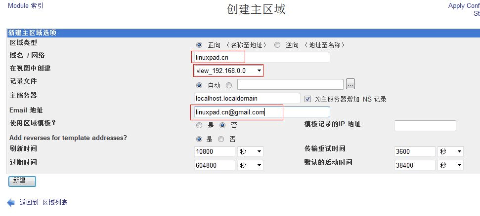 區(qū)域類型選擇”正向”,域名/網(wǎng)絡(luò)填寫域名”linuxpad.cn”, 在視圖創(chuàng)建選擇此主區(qū)域所屬的視圖,這里選擇”view_192.168.0.0”,E-mail地址須寫上,否則會(huì)報(bào)錯(cuò)。