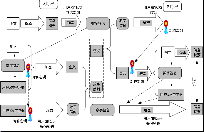 ①數(shù)字簽名:是通過一個(gè)單向函數(shù)對要傳送的報(bào)文進(jìn)行處理得到的用于認(rèn)證報(bào)文來源并核實(shí)報(bào)文是否發(fā)生變化的一個(gè)字母數(shù)字串。作用是數(shù)據(jù)完整性,不可否認(rèn)性,身份真實(shí)性; ②數(shù)字信封:是用加密技術(shù)來保證只有規(guī)定的特定收信人才能閱讀通信的內(nèi)容; ③數(shù)字摘要;