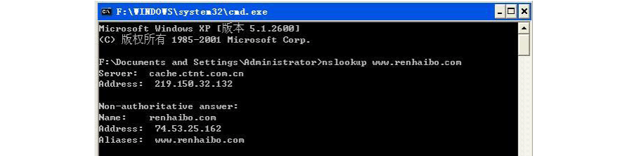 下面以海波博客的域名http://www.renhaibo.com為例,詳細(xì)介紹nslookup 命令在命令提示符(DOS )下的用法: