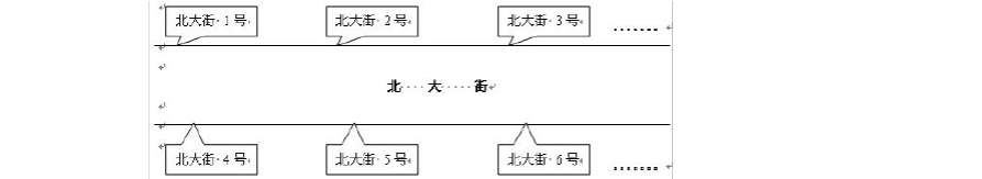 街道地址:北大街, 如果給該大街一個地址則用第一個住戶的地址-1, 此例為:北大街0號 住戶的號:如1號,2號等.