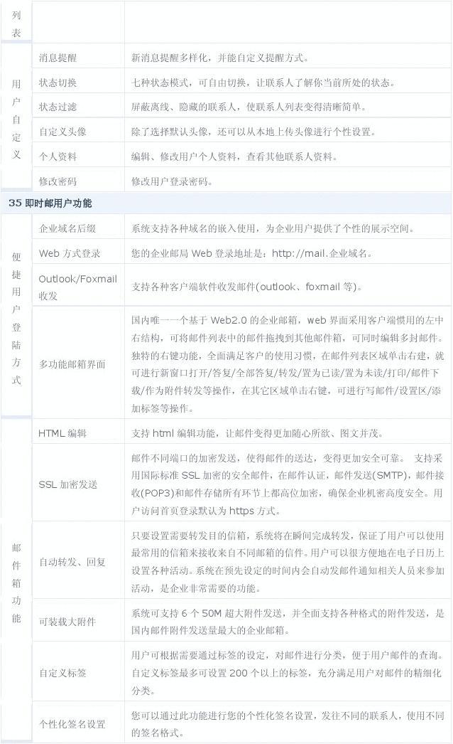 35即時(shí)郵管理功能 網(wǎng)址書簽功能(收藏夾) 網(wǎng)絡(luò)公文包 地調(diào)用地址和插入地址。地址簿導(dǎo)入/導(dǎo)出的文件支持.csv 和.vcard 兩種格式。 可以建立您的私人文件夾、上傳文檔、共享文檔、復(fù)制或轉(zhuǎn)移文檔。 系統(tǒng)不但能夠讓用戶導(dǎo)入和導(dǎo)出書簽,讓你的個(gè)人網(wǎng)頁書簽(bookmark)不論走到哪里都可以方便訪問,同時(shí)還能夠自動(dòng)連接到感興趣的網(wǎng)站,將內(nèi)容自動(dòng)摘取,存入數(shù)據(jù)庫。 您可能使用了多個(gè)免費(fèi)或其他收費(fèi)郵箱,通過代收郵箱(POP 代收)設(shè)置接收,讓您的所有郵箱都擁有了出色的智能過濾功能,更便于多郵箱的統(tǒng)一管理。同時(shí)代收郵箱還可以自定義發(fā)件人及回復(fù)的Email 地址。