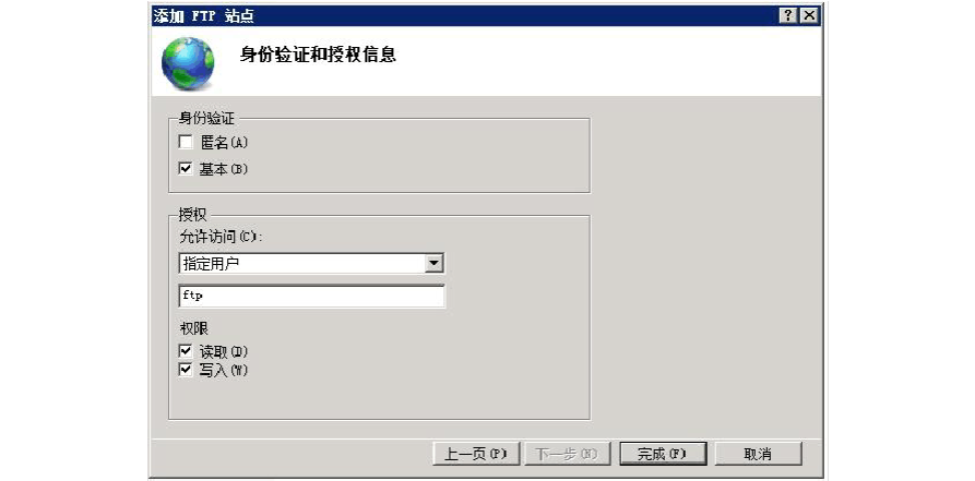 7. 點(diǎn)擊“下一步”,身份驗證選擇“基本”,授權(quán)選擇“指定用戶”(下圖中ftp 是用戶名稱),權(quán)限“讀取”和“寫入”。點(diǎn)擊“完成”