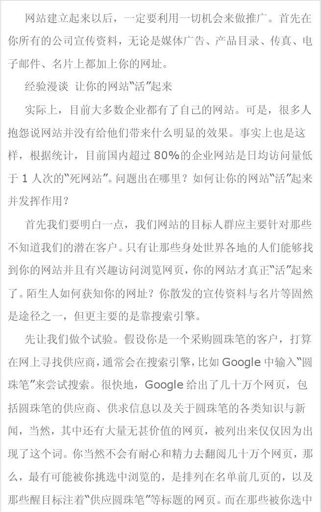 通過(guò)以上小試驗(yàn),我們不難得出“活網(wǎng)站”的四大關(guān)鍵因素:醒目明確的標(biāo)題、實(shí)質(zhì)性內(nèi)容、被搜索引擎列在比較靠前的位置、穩(wěn)定且瀏覽速度快。很遺憾,這恰恰是目前大多數(shù)企業(yè)網(wǎng)站忽視的問(wèn)題。比如很多公司在制作網(wǎng)頁(yè)的時(shí)候,因?yàn)椴涣私饩W(wǎng)頁(yè)和搜索引擎的特性,想當(dāng)然地把自己企業(yè)的名字作為網(wǎng)頁(yè)標(biāo)題,殊不知對(duì)于一個(gè)國(guó)外的客戶而言,除非公司名字中包含了產(chǎn)品名字,比如“天地圓珠筆廠”,否則僅僅是“天地貿(mào)易公司”的網(wǎng)頁(yè),多半被忽視----通常,客戶在面對(duì)幾十萬(wàn)網(wǎng)頁(yè)選擇的時(shí)候,給你的機(jī)會(huì)也許只有幾秒鐘。