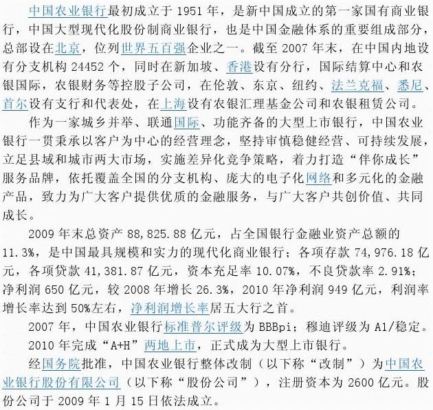 農業(yè)銀行股份有限公司注冊地址:北京市東城區(qū)建國門內大街69號 2010年7月15日,農行公司網上發(fā)行的103.10億股在上交所掛牌交易;H 股交易時間在7月16日在香港成功上市,至此四家國有大行全部完成“A H”兩地上市。農行A H股IPO 在全球募集221億美元,成為歷史上全球資本市場最大IPO 。