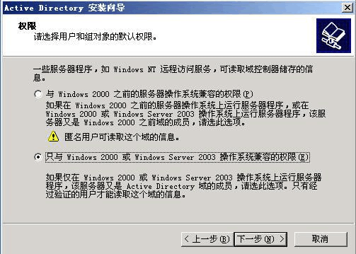 “這是一個權(quán)限的選擇項,在這里,我選擇第二項:“只與Windows 2000或Window 2003操作系統(tǒng)兼容的權(quán)限”,因為在我做實驗的整個環(huán)境里,并沒有Windows 2000以前的操作系統(tǒng)存在”