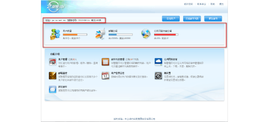 2) 在首頁(yè)的上部,您可以查看到本域目前使用的整體情況。