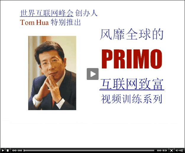 很多國內(nèi)的網(wǎng)友非常 關(guān)心Tom Hua課程的價(jià)格,其實(shí),準(zhǔn)確的說Tom Hua 的課程不僅僅是一個(gè)課程,而是一套系統(tǒng),這個(gè)系統(tǒng)就是風(fēng)靡全 球的PRIMO 互聯(lián)網(wǎng)致富系統(tǒng)。它在國外已經(jīng)風(fēng)靡了很多年,今天它終于成功轉(zhuǎn)換成一個(gè) 全新的中文系統(tǒng)。讓我們看看這個(gè)在國外被譽(yù)為“自動(dòng)網(wǎng)賺機(jī)器”的價(jià)值與價(jià)格。