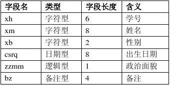 CREATE TABLE student (xh C(6)xb C(2),csrq D,zzmm L,bz M )
