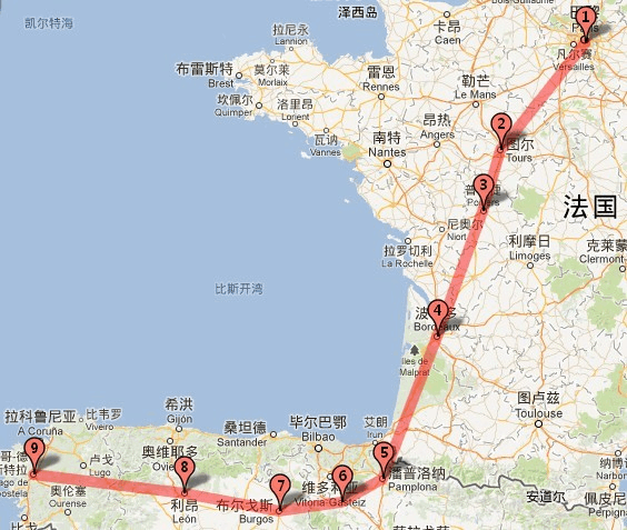 巴黎→圖爾→普瓦捷→波爾多→潘普洛納→洛格羅尼奧→布爾戈斯→萊昂→圣地亞哥-德孔波斯特拉