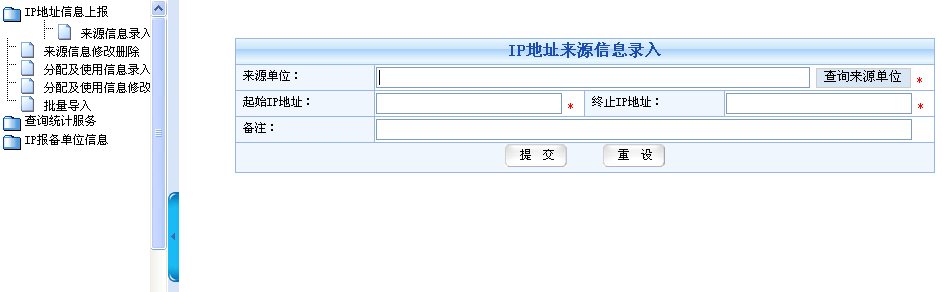 系統(tǒng)為IP 報備用戶提供了單條錄入IP 地址信息來源信息功能,在功能菜單中選擇“來源信息錄入”即可進(jìn)入錄入頁面:
