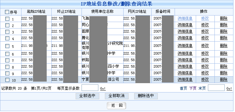 頁面分頁上顯示了所有符合條件的IP 報備信息,其中包括起始、終止IP 地址,使用單位名稱,網(wǎng)關(guān)IP 地址,報備時間,若用戶需要查看詳細(xì)報備內(nèi)容,直接點擊“詳細(xì)信息”鏈接,即可看到對應(yīng)內(nèi)容的詳細(xì)報備信息: