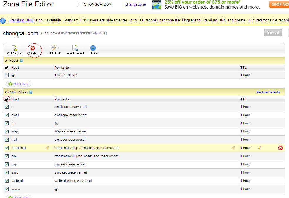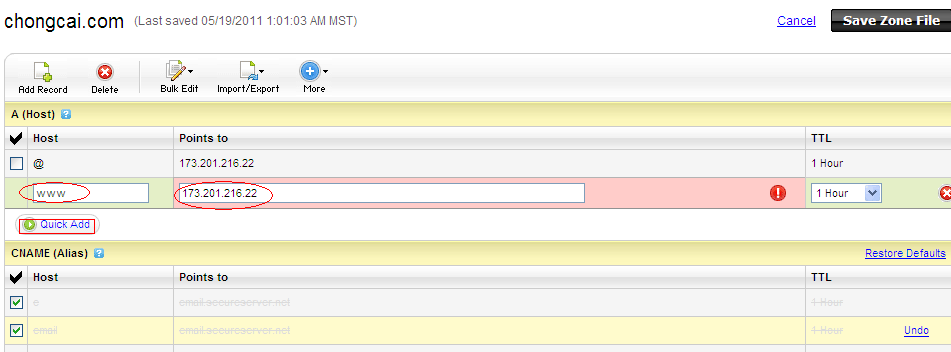 刪除后不要的東西后,就可以添加A 記錄或者CNAME (別名),以A 為例:先點(diǎn)擊A (Host)的Quick Add,在Host 里填上www ,point to填上你要綁定的IP ,然后點(diǎn)擊“Save Zone File”即可