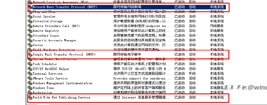 1) 在“控制面板”中打開“管理工具”,打開其中的“服務”,查看“NNTP服務”(Network News Transfer Protocol)、“SMTP服務”(Simple Mail Transfer Protocol)以及“萬維網(wǎng)服務