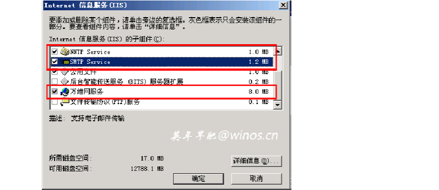 3) 在“Internet信息服務(IIS )”中,選中“NNTP Service”、 “SMTP Service”和“萬維網(wǎng)服務”所對應的復選框,再單擊“確定”。