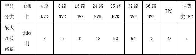 每個(gè)設(shè)備都會(huì)有連接路數(shù)的限制,比如一臺(tái)4路的NVR, 最大連接路數(shù)是8路,如果超出8路同時(shí)連接,那么就會(huì)提示超過最大連接數(shù),設(shè)備連接路數(shù)的對(duì)應(yīng)表如下