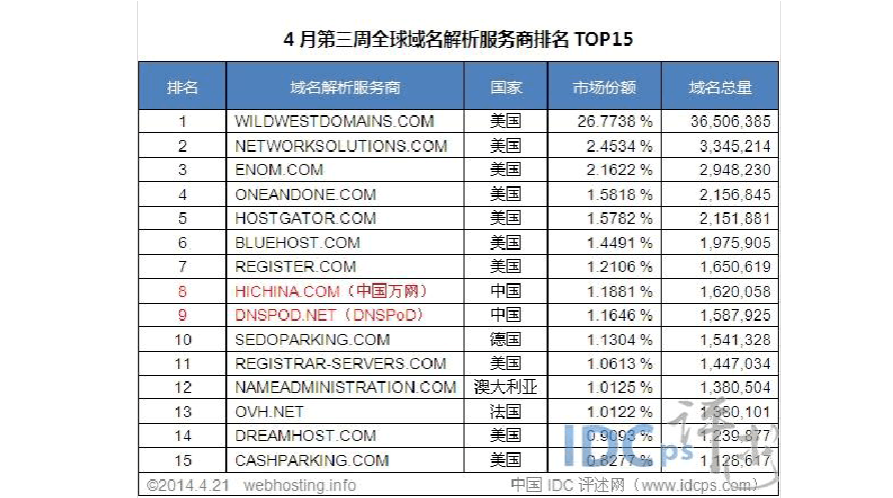 (圖2)4月第三周全球域名解析服務(wù)商排名TOP15(截至2014/4/21)