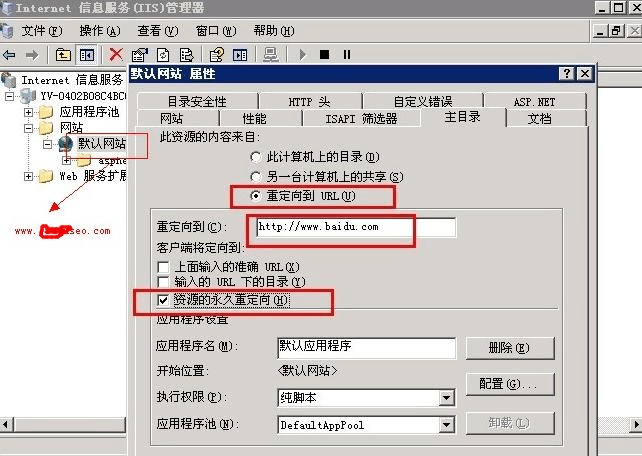 2. 新建站點對應(yīng)一個目錄E:wwwroot01web。該目錄下只需要2個文件,一個 default.html ,一個404.htm (我也試過其實新建新站的站點用www.piaolingseo.com 相同的文件可以)。在欲重定向的網(wǎng)頁或目錄上按右鍵;選中―重定向到URL‖;在對話框中輸入目標(biāo)頁面的地址(如http://www.piaolingseo.com/);切記,記得選 中―資源的永久重定向‖;當(dāng)然,最后要點擊―應(yīng)用‖,完成。如下圖所示: