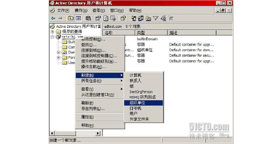 我們?yōu)榇蠹已菔疽幌氯绾蝿?chuàng)建一個組織單位。打開Active Directory 用戶和計算機(jī),選擇新建組織單位。