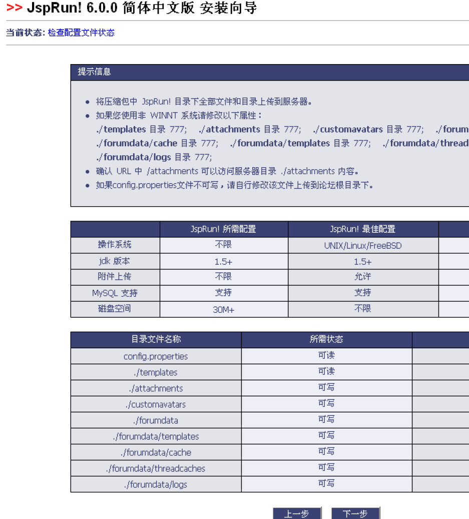 上傳完畢后,在瀏覽器中運行安裝程序(在瀏覽器地址欄敲入install.jsp ,即訪問 http://您的域名/論壇目錄/install.jsp)進入準備安裝頁面,如圖 5 所示: