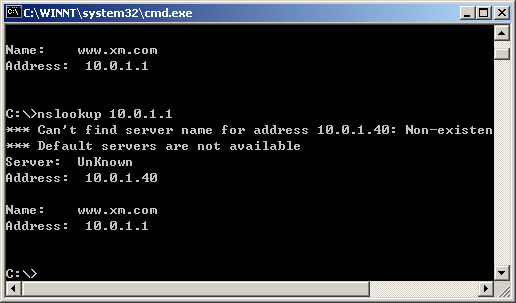 地址設(shè)置為我們所配置DNS 服務(wù)器的IP 地址。在命令控制臺中使用nslookup 命令解析域名,命令格式Nslooup www.abc.com。一一測試,如果所建立的域名www.xm.com 、bbs.xm.com 和ftp.xm.com 均能顯示出所對應(yīng)的IP 地址,則表示成功。如下圖。