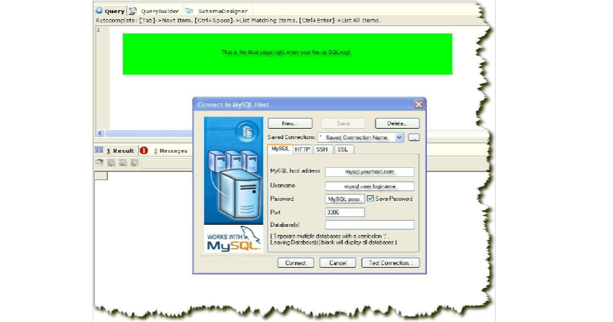 ,2) 在 MySQL Administrator 端口域中輸入相同的端口號。注意,你的 destination 端口必須保持 3306,原理是,你將數(shù)據(jù)發(fā)送到 3307 端口后, 數(shù)據(jù)通過通道發(fā)出,然后分流到 Dreamhost 的 3306 端口。 使用 SSH 在~/.ssh/config 文件中設置:nnHost your_nickname_for_your_host HostName User LocalForward your_dh_host_name.dreamhost.com your_shell_account_user_name 3307 your_full_db_host_name:3306nn只要這樣進行連接:nnsshyour_nickname_for_your_host mysql -h 127.0.0.1 -P 3307 -u db_user_name -p your_full_db_host_namen或使用一條命令:nnssh -4fNg -L 3307:your_full_db_host_name:3306 your_shell_account_user_name@your_dh_host_name.dreamhost.comn這樣 mysql 就連接上了。 注意: 盡管你在 Goodies->Manage MySQL 中為用戶添加了 localhost 主機,你還是會遇到 這樣的錯誤:nnERROR 1045 (28000): Access denied for user 'db_user_name'@'localhost' (using password: YES)n使用 127.0.0.1 來代替 localhost (會被 DH 攔截) (感謝 Shiva 提供該解決方案) 。 使用 SQLyog 你可能也想獲取免費的 SQLyog 版本,下面的截圖顯示了它的配置是多么的簡單:nn