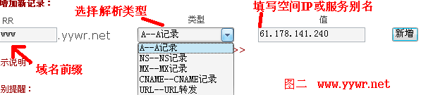 RR 這里填寫你的域名, 如你準(zhǔn)備用www.yywr.net 這個域名的話就在RR 下這個框里填寫”www ”, 如果準(zhǔn)備直接用yywr.net 的話,RR 這里就空著不填;