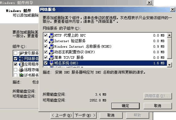 口,單擊“添加/刪除程序Windows 組件”,打開“Windows 組件向導”對話框,選中“網絡服務”復選框,單擊“詳細信息”按鈕,在打開的“網絡服務”對話框,選中“域名系統(tǒng)DNS ”復選框,如圖8.14所示,然后單擊“確定”按鈕。 9