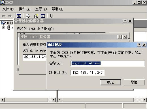 ,“192.168.11.240”,單擊“確定”按鈕,彈出“確認授權”對話框,顯示DHCP 服務器的名稱和IP 地址,如圖8.5。