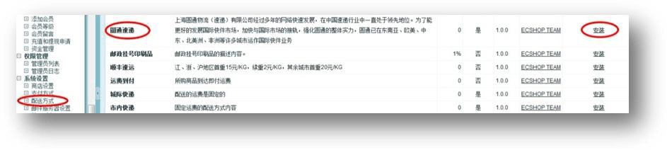 在左邊菜單欄里系統(tǒng)設(shè)置下選擇配送方式。然后在右邊列表中找到圓通速遞(也可以選擇其他的),點(diǎn)擊右邊安裝就完成了。頁(yè)面會(huì)自動(dòng)跳轉(zhuǎn)到新建配送區(qū)域,填寫(xiě)完成后在所轄地區(qū)中選擇中國(guó)后點(diǎn)右邊的“ ”即可(省,市,縣不需填寫(xiě))。點(diǎn)擊確定。