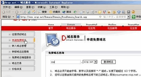 ,重新到 Oray.net 網(wǎng)站首頁,用剛剛申請(qǐng)的Oray 護(hù)照登錄,點(diǎn)擊導(dǎo)航欄 “ 域名服務(wù) ” ,選擇 “ 申請(qǐng)免費(fèi)域名 ” ,然后查詢你要申請(qǐng)的免費(fèi)域名是否可注冊(cè):