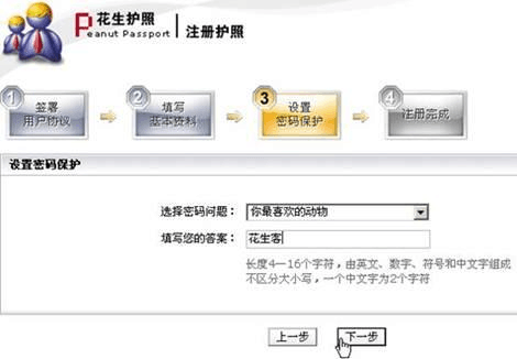 4. 填寫密碼保護(hù)問題(可要記住哦),點(diǎn)下一步: