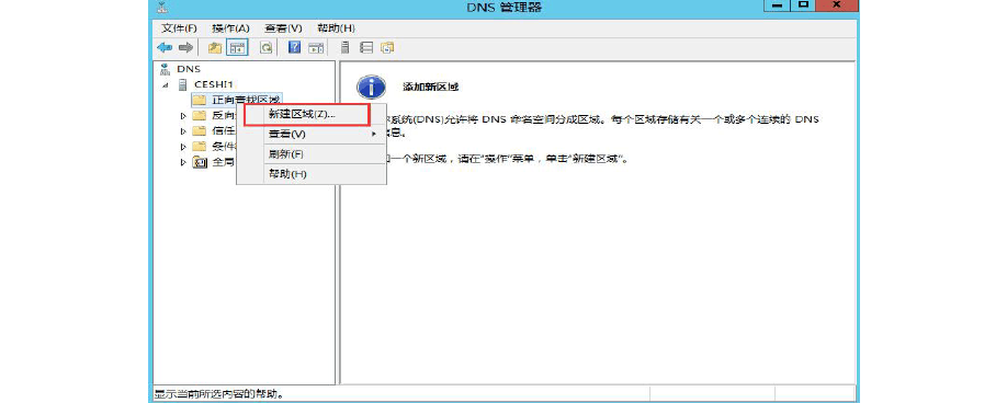 在展開的目錄【正向查找區(qū)域】中設(shè)定我們的正向查詢域(正向查詢:由域名查詢IP ;反向查詢:由IP 查詢域名),先雙擊【正向查找區(qū)域】使其前面三角符號消失,再在【正向查找區(qū)域】上右擊,選擇【新建區(qū)域】,