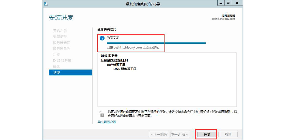 當結(jié)果中出現(xiàn)【已在XXXX 上安裝成功】后,點擊【關(guān)閉】結(jié)果服務安裝。
