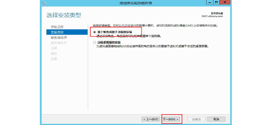在安裝類型中選擇【基于角色或基于功能的安裝】,