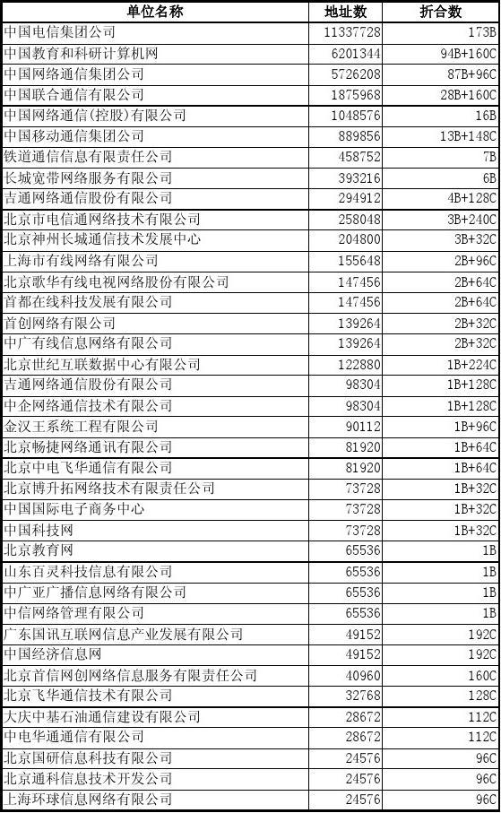 注3:此表只列出擁有IP 地址數(shù)大于或等于32C 的單位。