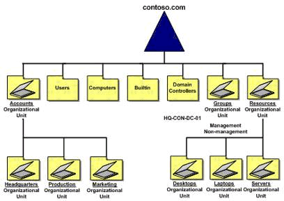 該通用結(jié)構(gòu)基于的是虛構(gòu)組織“Contoso”?!癈ontoso”的 DNS 名為“contoso.com”,它是使用前面介紹的“Active Directory 安裝向?qū)А迸渲玫?。圖 4 中顯示的是示例 Active Directory 結(jié)構(gòu)。