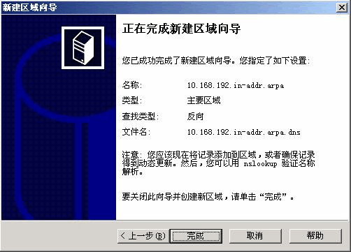 (6)選擇“不允許動態(tài)更新” ,單擊“下一步” ,進入“正在完成新建區(qū)域向?qū)А睂υ?框,如圖 5-10 所示。