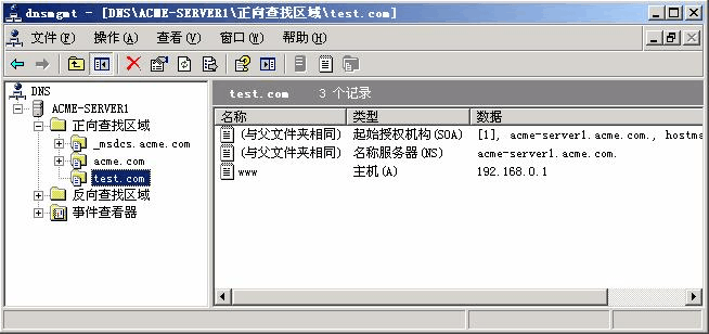 (10)創(chuàng)建完畢后,在“dnsmgmt”控制臺選中“test.com”區(qū)域,在右側(cè)會顯示該區(qū) 域相關(guān)記錄,如圖 5-14