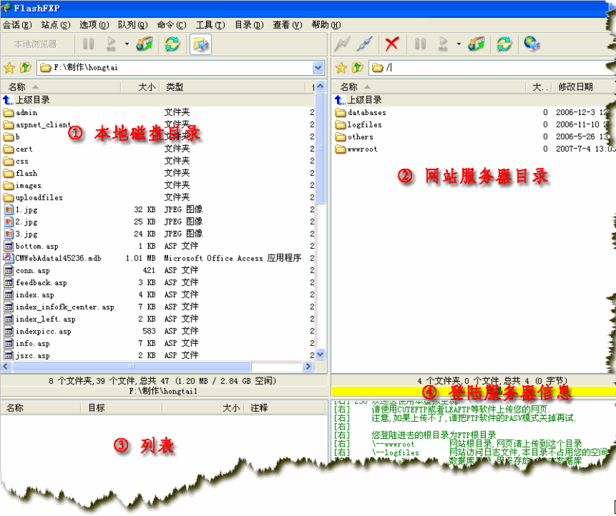 窗口4:顯示你登陸空間FTP 的信息,通過登陸信息你可以了解到你上傳的文件是否成功,