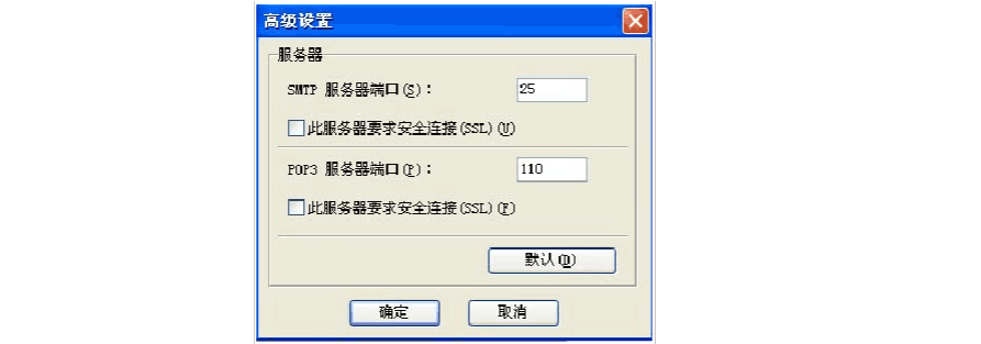 2、如果您的郵件收發(fā)不需要采用SSL 加密,點擊“高級”,SMTP 端口參數(shù)設(shè)置:25,pop3參數(shù)設(shè)置:110,如果使用IMAP 協(xié)議,參數(shù)設(shè)置為:143