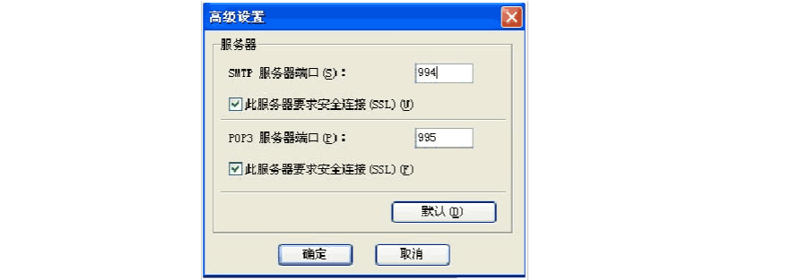 如果您的郵件收發(fā)需要采用SSL 加密,點擊“高級”,請選擇“此服務(wù)器要求安全連接SSL ”,SMTP 端口參數(shù)設(shè)置為:994,pop3端口設(shè)置為:995,如果使用IMAP 協(xié)議,參數(shù)設(shè)置為: