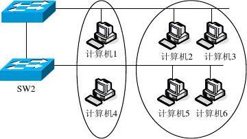 利用 VLAN 技術(shù)可以把物理上連接的網(wǎng)絡(luò)從邏輯上劃分為多個虛擬子網(wǎng),可以對各個子網(wǎng)實施不同的管理策略。圖1表示兩個交換機相連,把 6 臺計算機配置成連個 VLAN 。