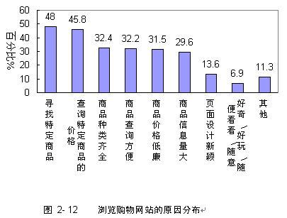 被訪者瀏覽購物網(wǎng)站的主要目的有尋找特定的商品和查詢價(jià)格,網(wǎng)站吸引用戶登陸的因素有商品種類齊全、查詢方便、商品價(jià)格低以及商品信息量大等。因此購物網(wǎng)站欲增加其吸引力,可以通過增加特色商品的種類等方面來入手。此外,網(wǎng)站設(shè)計(jì)的藝術(shù)性也是吸引用戶瀏覽的因素之一。