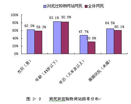 在瀏覽過購物網(wǎng)站的被訪者中,男性(60.6)多于女性,年齡絕大多數(shù)在35歲以下(89.2),受教育程度多為大專及以上(75.0),未婚(包括離異/喪偶等)占到61.9,學(xué)生約占30。從另外一個(gè)方面看,有瀏覽購物網(wǎng)站經(jīng)歷的女性占所有女性網(wǎng)民的比例要高于男性;年齡為18-35歲年齡段的被訪者瀏覽過購物網(wǎng)站的比例高于其他年齡段;受教育程度為大專/大本的瀏覽過購物網(wǎng)站的比例較高,而為初中及以下/博士的比例卻較低;未婚和 與全體網(wǎng)民的結(jié)構(gòu)相比較,瀏覽過購物網(wǎng)站的網(wǎng)民在性別和年齡結(jié)構(gòu)上具有較強(qiáng)的一致性,但大本及以上的比例要遠(yuǎn)高于全體網(wǎng)民,未婚所占的比例也高于全體網(wǎng)民。
