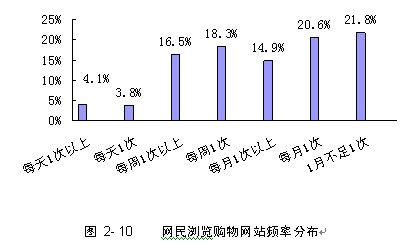 被訪者對(duì)購物網(wǎng)站的瀏覽頻率如圖2-10所示。可以看出絕大多數(shù)為每周一次到每月一次,達(dá)到了53.8。頻率高于每周一次的也有大約1/4。瀏覽頻率較高的被訪者占了相當(dāng)?shù)谋壤?,說明瀏覽很容易成為一種慣性行為,他們很自然的將瀏覽購物網(wǎng)站作為重要的信息來源。瀏覽次數(shù)多的人極有可能轉(zhuǎn)成網(wǎng)絡(luò)購物的體驗(yàn)者。