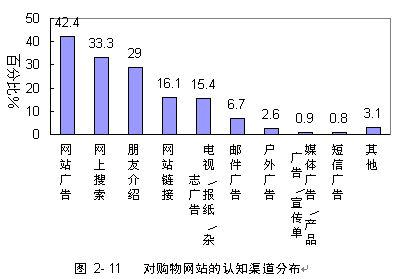 被訪者對(duì)購物網(wǎng)站的認(rèn)知途徑主要有下面三種方式:廣告、網(wǎng)上搜索和朋友等介紹,如圖2-11所示。廣告以網(wǎng)站廣告和網(wǎng)站鏈接的方式最多,此外還有傳統(tǒng)媒體廣告等方式;網(wǎng)上搜索已經(jīng)成為網(wǎng)民認(rèn)知購物網(wǎng)站的重要工具,有1/3的用戶曾經(jīng)使用搜索引擎來查找購物網(wǎng)站;朋友等熟人的推薦介紹也是被訪者認(rèn)知購物網(wǎng)站的重要途徑。