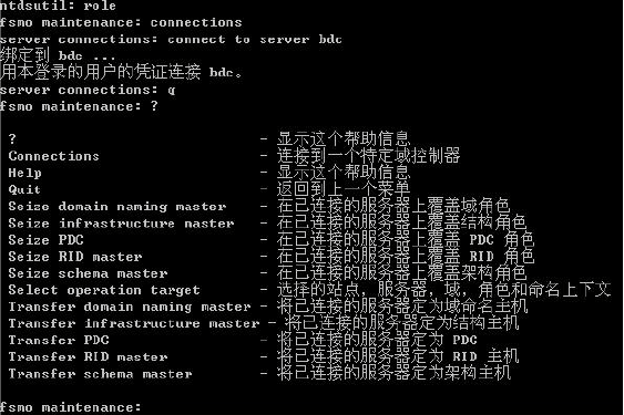 11、現(xiàn)在登陸PDC (主域控制器),進入命令提示符窗口,在命令提示符下輸入:ntdsutil 回車,再輸入:roles 回車,再輸入connections 回車,再輸入connect to server BDC --> (備注:這里的dc-1是指服務(wù)器名稱),提示綁定成功后,輸入q 退出,如圖: