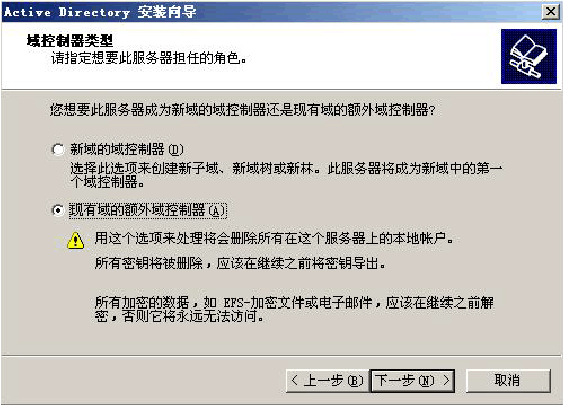 這里由于是安裝第二臺域控制器,所以選擇【現(xiàn)有域的額外域控制器】,點【下一步】。如圖