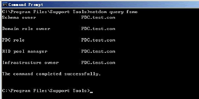 14、 這五個步驟完成以后,檢查一下是否全部轉(zhuǎn)移到BDC 上了,打開在第9步時裝windows support tools,開始->程序->windows support tools->command prompt,輸入netdom query fsmo,如圖:全部轉(zhuǎn)移成功. 現(xiàn)在五個角色的owner 都是BDC 了.