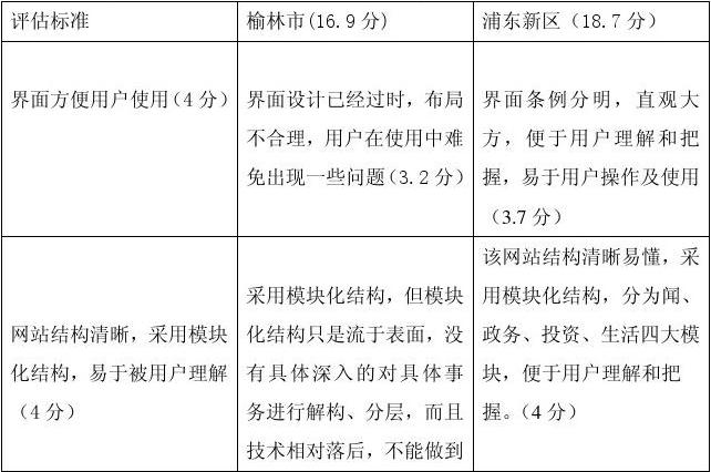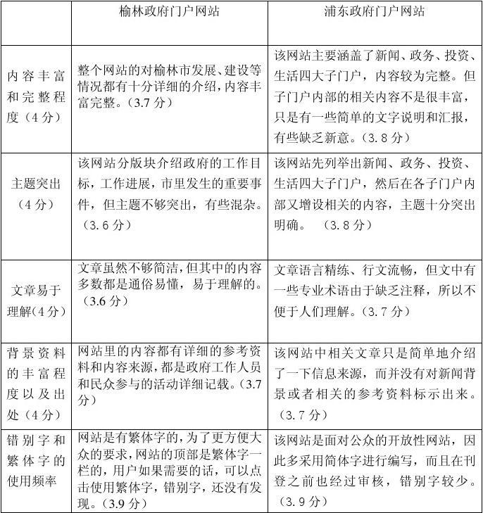 介于二者內(nèi)容的對比,上海浦東政府門戶網(wǎng)站得分為3.8分,榆林市政府門戶網(wǎng)站得分為3.6分。